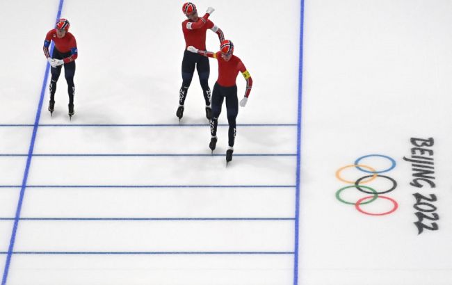 15.02.2022 - 13:38 Мужская сборная Норвегии выиграла олимпийское "золото" в командных соревнованиях по конькобежному спорту