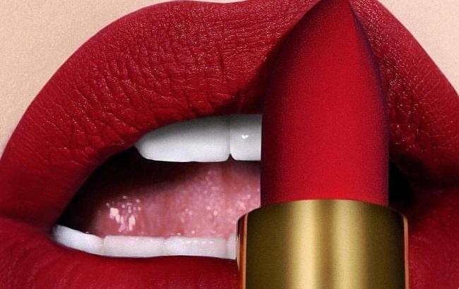 5. На незаполненный центр губ нанести помаду красного цвета, похлопывающими движениями кисти соединить ее с уже имеющейся на губах палитрой.
