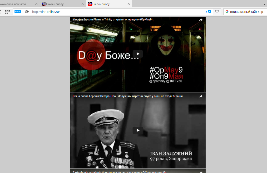 Альянс украинских хакеров из анонимных кибергруппировок FalconsFlame и Trinity провели операцию #OpMay9 с 00:00 9 мая, осуществив в общей сложности девять успешных взломов сайтов самопровозглашенной "Донецкой народной республики" (ДНР), пророссийских веб-ресурсов агрессивной антиукраинской пропаганды и частных военных компаний (ЧВК) РФ, которые действуют в Украине и Сирии под протекцией российской ФСБ. Об этом говорится в сообщении международного волонтерского сообщества "ИнформНапалм" по итогам Дня победы 2016.