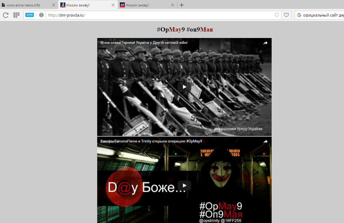 Как отмечается, на взломанных сайтах хакеры оставляли хэштеги #OpMay9 и #оп9Мая, а также по три коротких видео о Второй мировой войне и вкладе украинского народа в победу над нацизмом.