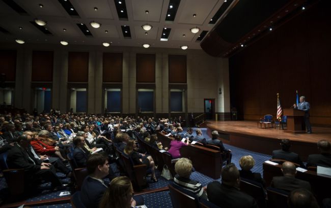 Отмечается, что выступление на Форуме "Борьба Украины за свободу продолжается" в Капитолии стало первым из серии мероприятий в трехдневном визите в Соединенные Штаты Америки. Президент Петр Порошенко подчеркнул, что для успеха украинского государства критической является поддержка международных партнеров в достижении мира, и Запад не может сдаться в вопросе Украины.