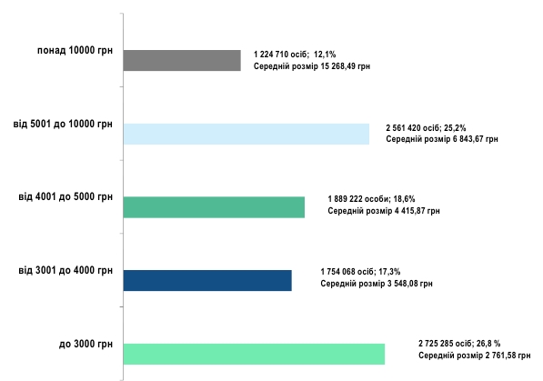- до 3000 гривень - 26,8%, 2 725 285 осіб, середня пенсія - 2 761,58 гривень,