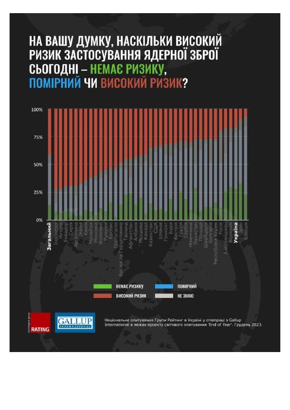 Загалом протягом року у світі не відбулося значного зменшення страхів від ядерної загрози. Дві п'ятих опитаних бачать високий ризик використання ядерної зброї. Майже така ж частка оцінок помірного ризику, і лише 14% не бачать ризику.