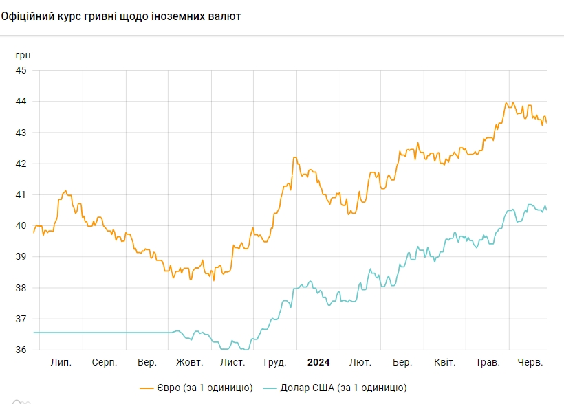 Офіційний курс на 27 червня 2024 року встановлено на такому рівні: 40,5138 грн за 1 долар (-0,1407 грн).