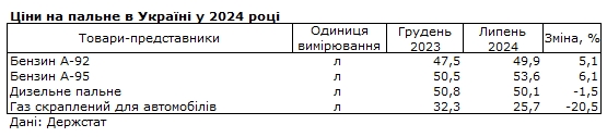 За даними статистичного відомства, у липні 2024 року, порівняно з груднем 2023 року, бензин А-92 подорожчав на 5,1% до 49,9 гривень за літр, бензин А-95 подорожчав на 6,1% до 53,6 гривень за літр. . Дизельне паливо подешевшало на 1,5% - до 50,1 гривень за літр.