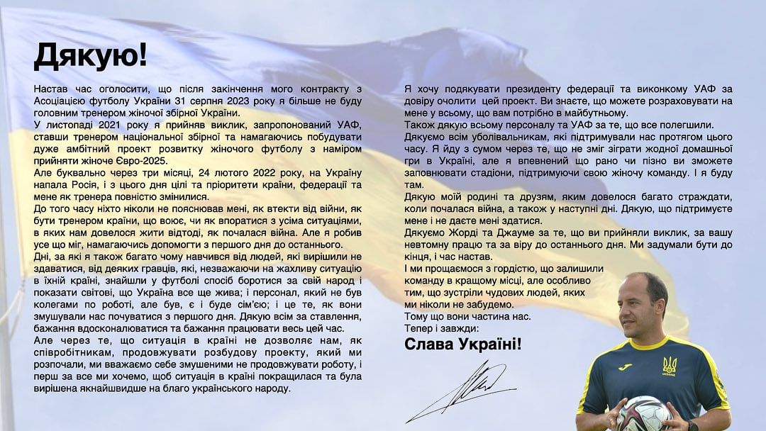 36-річний іспанець оголосив, що покине тренерський місток "синьо-жовтих" 31 серпня. У цей день завершиться його контракт із Українською асоціацією футболу.