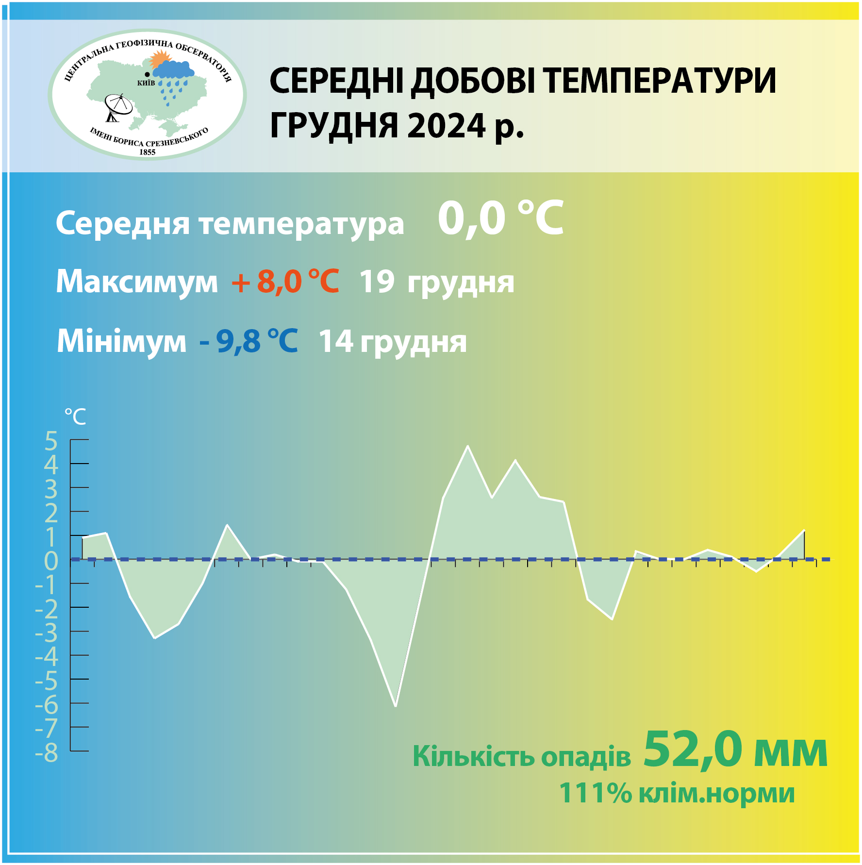 Середньомісячна температура повітря у грудні 2024 року в Києві дорівнювала 0 градусів. Це на 1,8 градусів вище за кліматичну норму.
