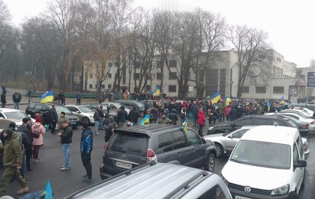 Участники акции скандируют: "Банду геть", у людей в руках плакаты с надписями: "Юрий Луценко - защитник коррупции", "За НАБУ". Участники автопробега ждут, когда к ним выйдут.