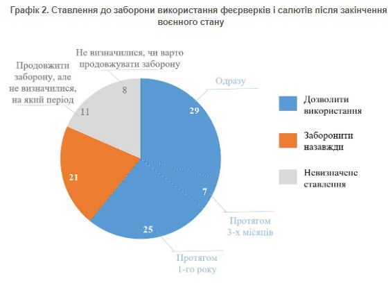 Наполягають на забороні використання феєрверків і салютів назавжди 21%, ще 11% за заборону, але поки не знають, на який час. Решта 8% мають невизначене ставлення.