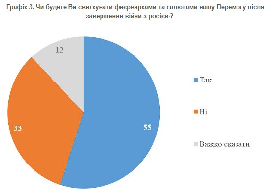 Крім того, більше половини українців (55%) відповіли, що перемогу над Росією будуть святкувати феєрверками та салютами.