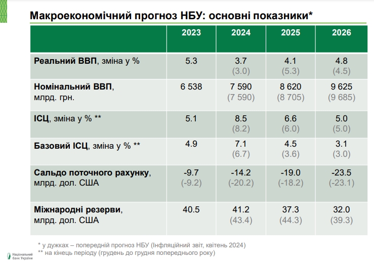 За прогнозом НБУ, у 2025 році економіка зросте на 4,1% (попередній прогноз - 5,3%), у 2026 році ВВП збільшиться на 4,8% (попередній прогноз - 4,5%).
