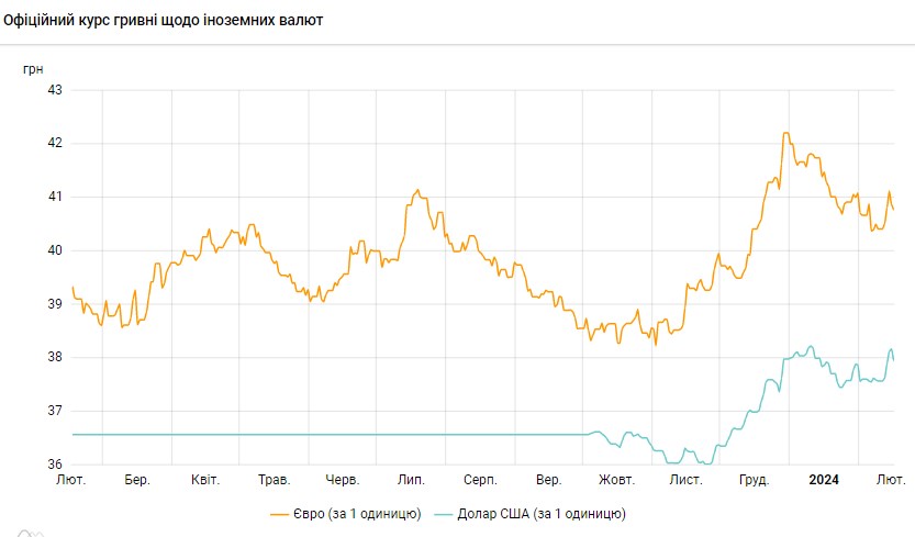 Кабінет міністрів у бюджеті на 2024 рік заклав середній курс на рівні 40,7 грн/долар, до кінця 2024 року курс очікується на рівні 42,1 грн/долар.