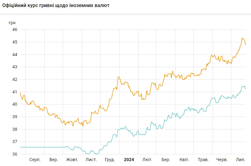 Офіційний курс на 24 липня 2024 року встановлено на такому рівні: 41,2316 грн за 1 долар (-0,1053 грн).