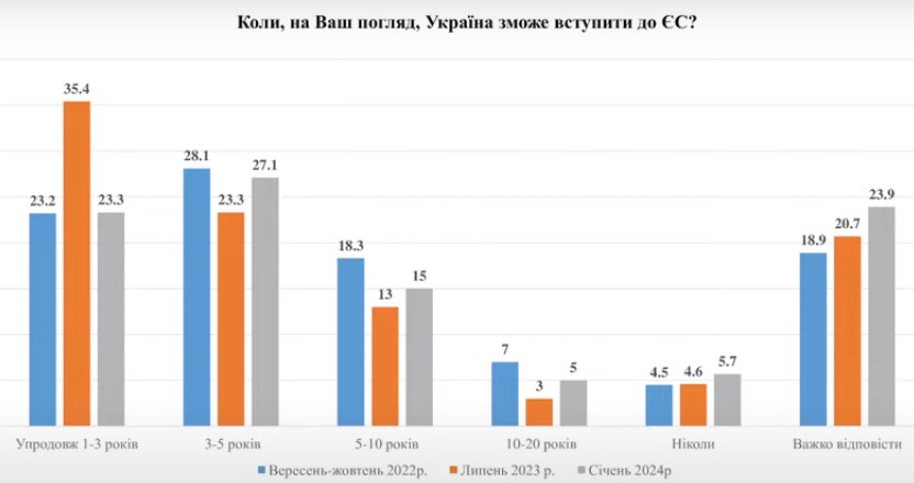 Зокрема, 23,3% заявили, що вступ відбудеться за 1-3 роки (у липні 2023 року так вважали 35,5%), а 27,1% - що протягом 3-5 років (у липні 2023 року - 23,3%).