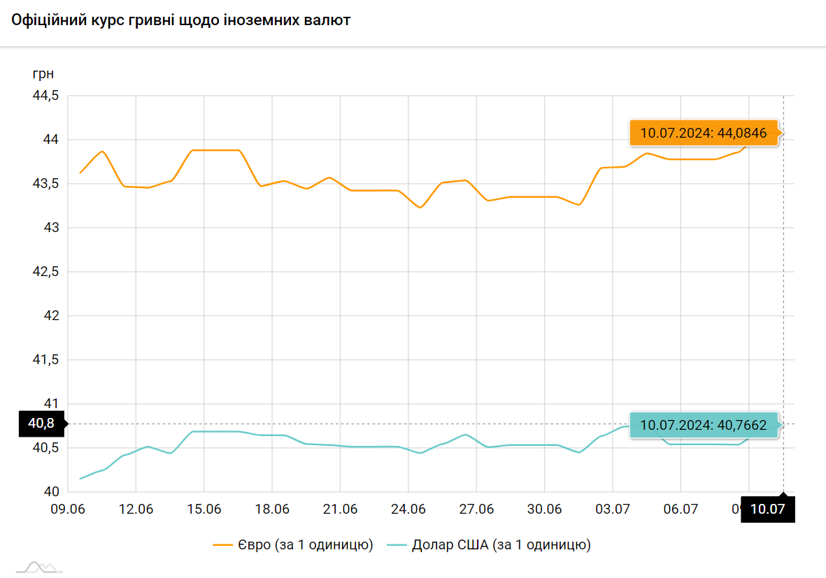 З 9 червня до 10 липня 2024 року гривня девальвувала на 61 копійку щодо долара США. За офіційним курсом Національного банку України станом на 9 червня курс гривні становив 40,15 грн/дол., а до 10 липня він впав до 40,76 грн/дол. Цей місяць характеризувався зниженням надходжень валютної виручки від експортерів та підпищеним попитом на іноземну валюту.
