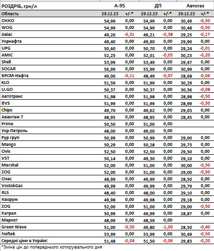 За даними моніторингу, середні роздрібні ціни 29 грудня на бензин А-95 становлять 51,48 гривні за літр (-2,88 гривні за місяць), на дизельне паливо 51,50 гривні за літр (-2,80 гривні), на автогаз 29,83 гривні за літр (-6,83 гривні).