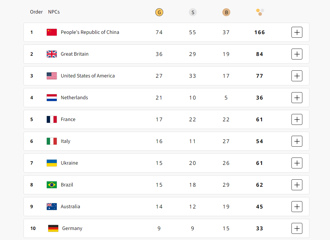 Збірна України втримала 7-му позицію в загальному списку команд. Вітчизняні параатлети здобули загалом 61 нагороду, зокрема 15 золотих. Безумовним лідером класифікації залишився Китай – 166 медалей. Доповнили топ-3 Сполучене Королівство та США.