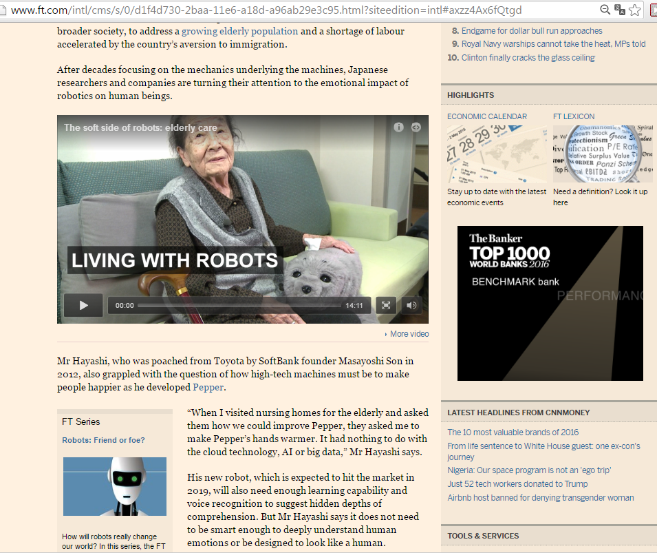 Японский премьер Синдзо Абэ выступает за расширение использования роботов, напоминает FT, чтобы справиться с проблемой ускоренного старения населения и нехватки трудовых ресурсов.