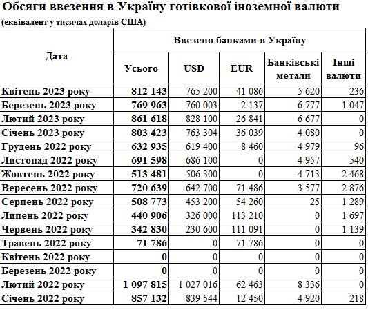 Обсяг готівкової іноземної валюти, яку банки ввезли до України у квітні 2023 року, становив 812,1 млн доларів. Це на 42,2 млн доларів більше, ніж у березні.