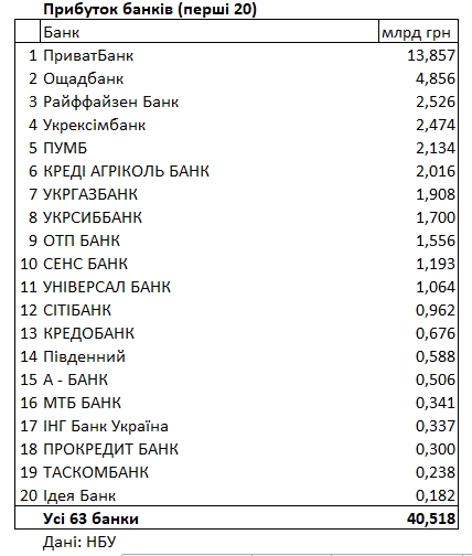 Рейтинг із прибутковості очолює державний ПриватБанк, який заробив 13,857 млрд гривень.