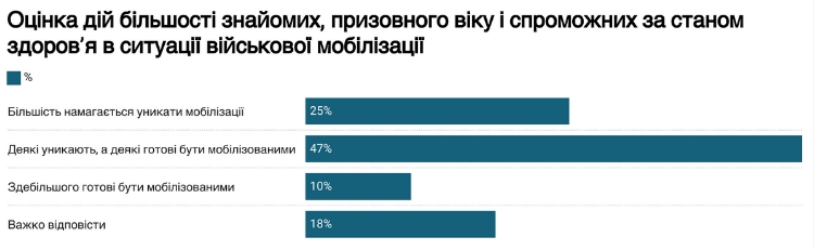 Зокрема 25% опитаних зазначили, що більшість з їхнього оточення намагаються уникати мобілізації, водночас 47% повідомили, що деякі зі знайомих уникають, а деякі готові бути мобілізованими. При цьому 10% заявили, що їхні знайомі здебільшого готові до мобілізації.