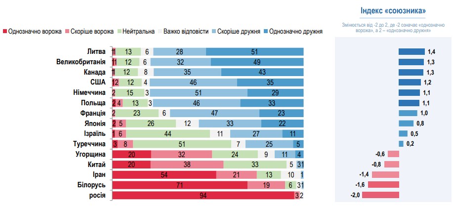 Станом на лютий 2024 року більшість громадян вважає дружніми до України США і Великобританію (по 81%), Німеччину (80%), Польщу і Литву (по 79%), Канаду (78%), Францію (70%), Японію (55%).