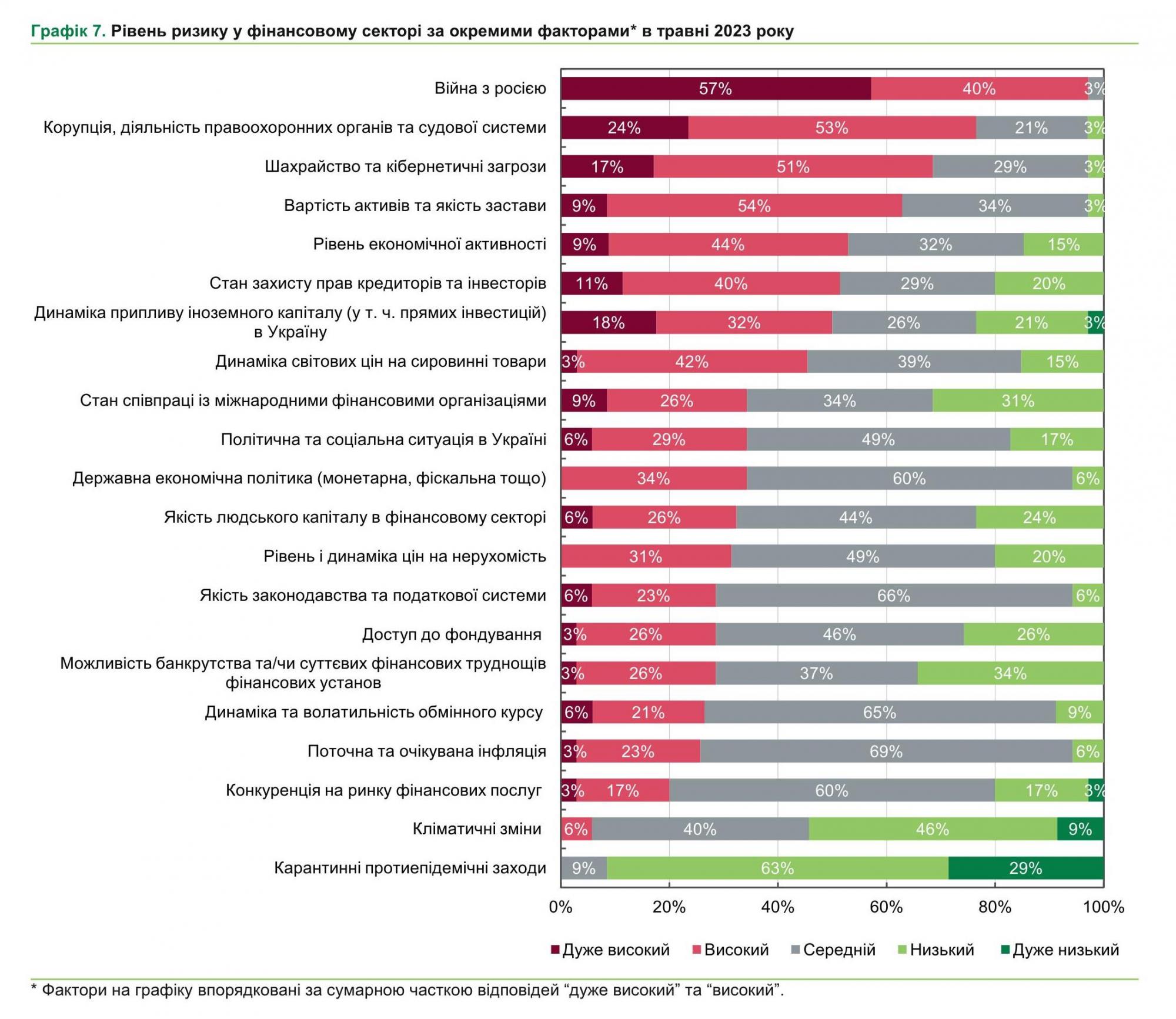 Останнє опитування топ-менеджерів фінансових установ суттєво змінило перелік основних джерел ризиків у фінансовому секторі. Незмінною залишається думка респондентів лише стосовно основного ризику - війна з Росією й надалі створює найвищі ризики для системи (97%).