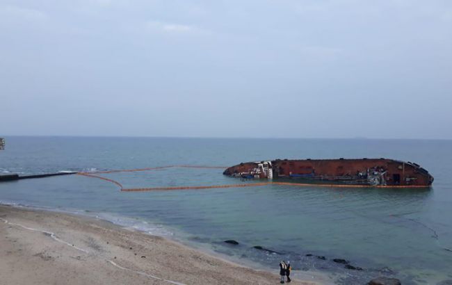 Отмечается, что 300 метров бонов повышенной плавучести закреплены на якорях и окружают судно, которое находится вблизи одесского пляжа "Дельфин".
