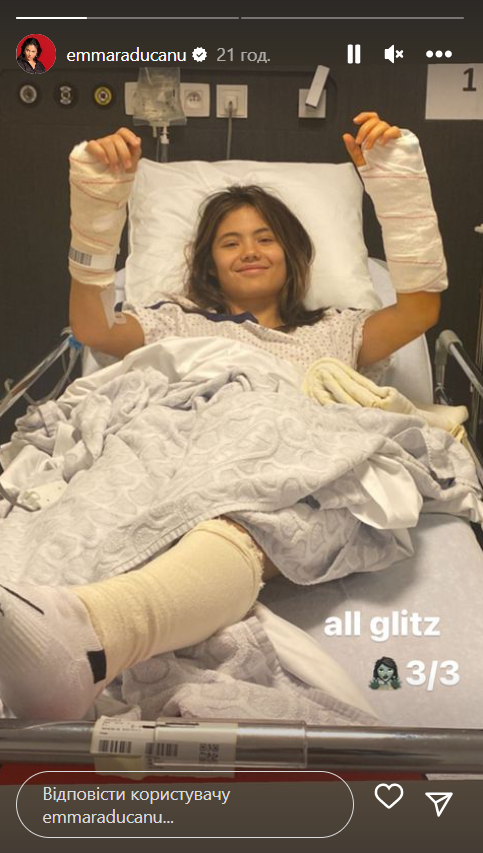 Про завершення циклу хірургічних втручань британська тенісистка Емма Радукану сповістила світлиною з лікарняної палати.