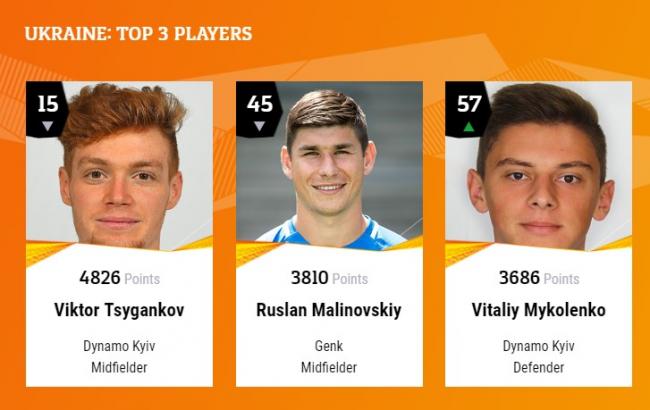Наивысшую позицию из наших игроков занимает хавбек "бело-синих" Цыганков - на 15 месте. В его активе 4826 очков. 46 в рейтинге хавбек бельгийского клуба Малиновский. У него 3816 баллов. А юный защитник киевлян Миколенко занимает 57 место с 3686 баллами.