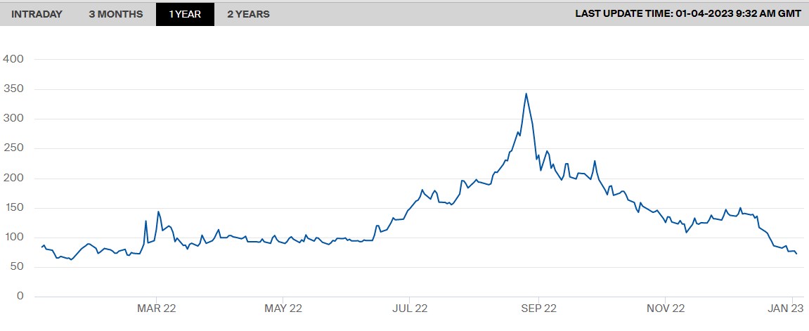 Нагадаємо, ціни на газ, які ще наприкінці літа 2022 року перевищували 300 євро за мегават-годину, до середини грудня знизилися до 130 євро, а до кінця грудня - до 80 євро за мегават-годину. до рівня, на якому вони востаннє були на початку російського вторгнення в Україну.