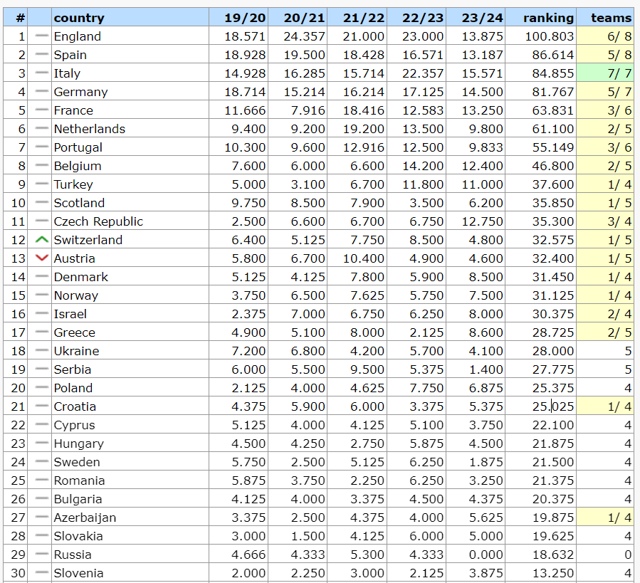 У нинішньому сезоні вітчизняні колективи набрали всього 4,100 пункта. Такий результат став найгіршим від сезону 2007/08. Із країн, що перебувають нижче за України, представництво в єврокубках зберігають Хорватія (25,025 балів) і Азербайджан (19,875).