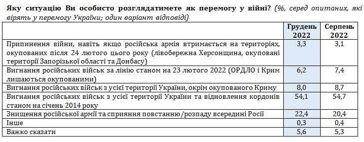Абсолютна більшість (54%) українців вбачає перемогу у вигнанні російських військ з усієї території України та відновленні кордонів станом на січень 2014 року. Ще 22% вважають, що на цьому не можна зупинятися і треба домагатися повного знищення російської армії та розпаду РФ зсередини.