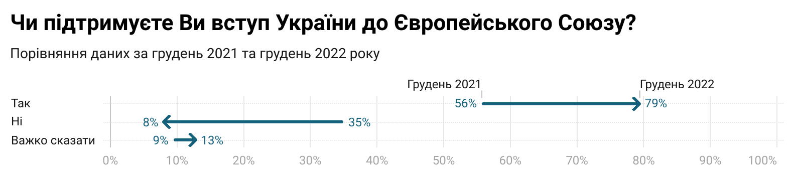 Порівняно з груднем 2021 року, частка громадян, які виступають за членство України в ЄС, зросла на 24%, водночас за рік частка тих, хто проти вступу країни до ЄС, впала на 27%