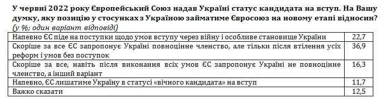 За даними опитування, 37% опитаних вірять, що після того як Україна виконає усі вимоги ЄС, країні запропонують повноцінне членство. Ще 23% сподіваються, що враховуючи обставини, країни члени ЄС підуть на поступки та запропонують Україні членство навіть якщо вона не виконає всіх необхідних умов. Водночас 28% вважають, що Україна все одно не стане повноцінним членом ЄС: їй або запропонують альтернативний статус (16%), або Україна так і залишиться на віки вічні у статусі кандидата (12%).