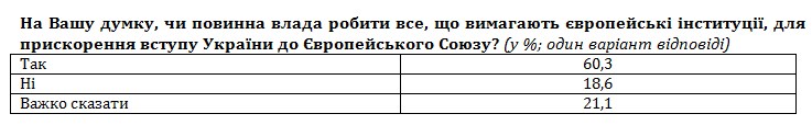 При цьому 60% опитаних вважають, що українська влада повинна виконувати всі вимоги європейських інституцій, якщо це зможе прискорити вступ України до ЄС. Не згодні з цим твердженням 19%, ще 21% опитаних не зміг визначитися зі своєю позицію щодо цього питання.