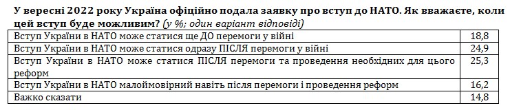Оцінюючи шанси вступу України до НАТО, українці розділилися. Чверть вважає, що Україна зможе стати повноправним членом НАТО одразу після перемоги у війні. Стільки ж опитаних вважає, що, окрім перемоги, Україні ще доведеться реалізувати всі необхідні для вступу реформи. Ще 19% респондентів вірить, що Україну візьмуть до НАТО ще до закінчення війни, а 16% українців взагалі не дуже вірять в те, що Україна коли-небудь увійде до НАТО.