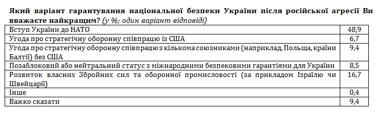Половина (49%) українців вважають вступ до НАТО найкращим варіантом гарантування безпеки для України. Ще 9% респондентів вважають, що надійніше буде укласти угоду про стратегічну оборону з декількома країнами за винятком США. Водночас 7% опитаних вважають, що угоду про стратегічну оборону варто укладати виключно з США. Крім того, 17% українців переконані, що найкращим гарантом безпеки для України може стати лише сама Україна, шляхом розвитку власних збройних сил. Ще 9% продовжують підтримувати позаблоковий статус для України з міжнародними безпековими гарантіями.