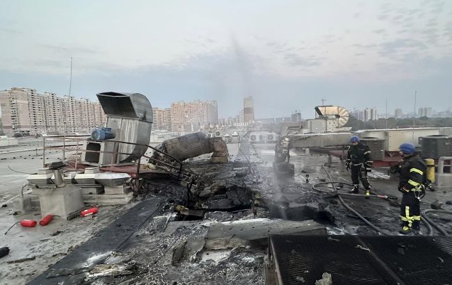 Російські війська цієї ночі здійснили масовану атаку на Київ. Внаслідок падіння уламків у Дарницькому районі столиці виникла пожежа на даху торговельного центру "Ашан".