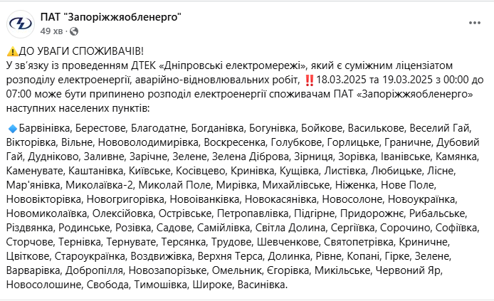 З повним списком населених пунктів, де відключатимуть світло, можна ознайомитися на Facebook-сторінці "Запоріжжяобленерго".