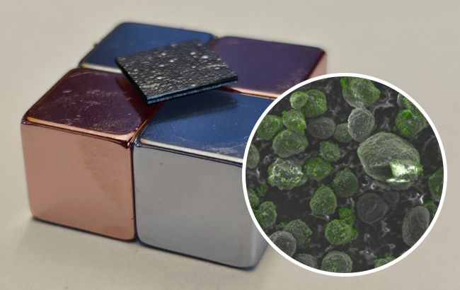 Графітові мікрочастинки зі спеціальним ізоляційним покриттям - зелені області вказують на наявність кремнію (інфографіка: oist.jp)