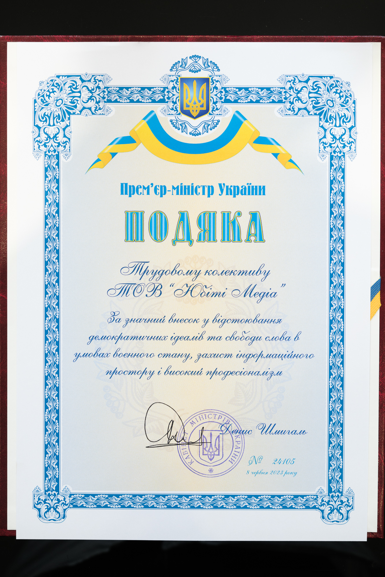 Благодарность от премьер-министра Украины Дениса Шмыгаля трудовому коллективу ООО "Юбити Медиа" "За значительный вклад в отстаивание демократических идеалов и свободы слова в условиях военного положения, защиту информационного пространства и высокий профессионализм".