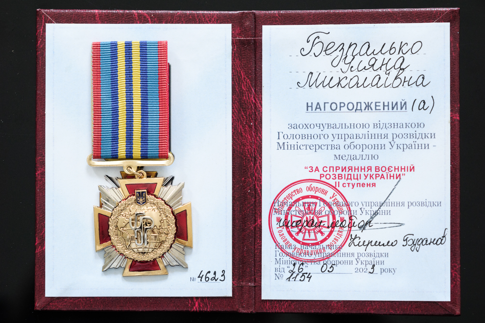 Медалью Главного управления разведки Украины Министерства обороны Украины "За содействие военной разведке Украины" II степени приказом начальника ГУР Минобороны Кирилла Буданова 26 мая 2023 награждена Ульяна Безпалько.