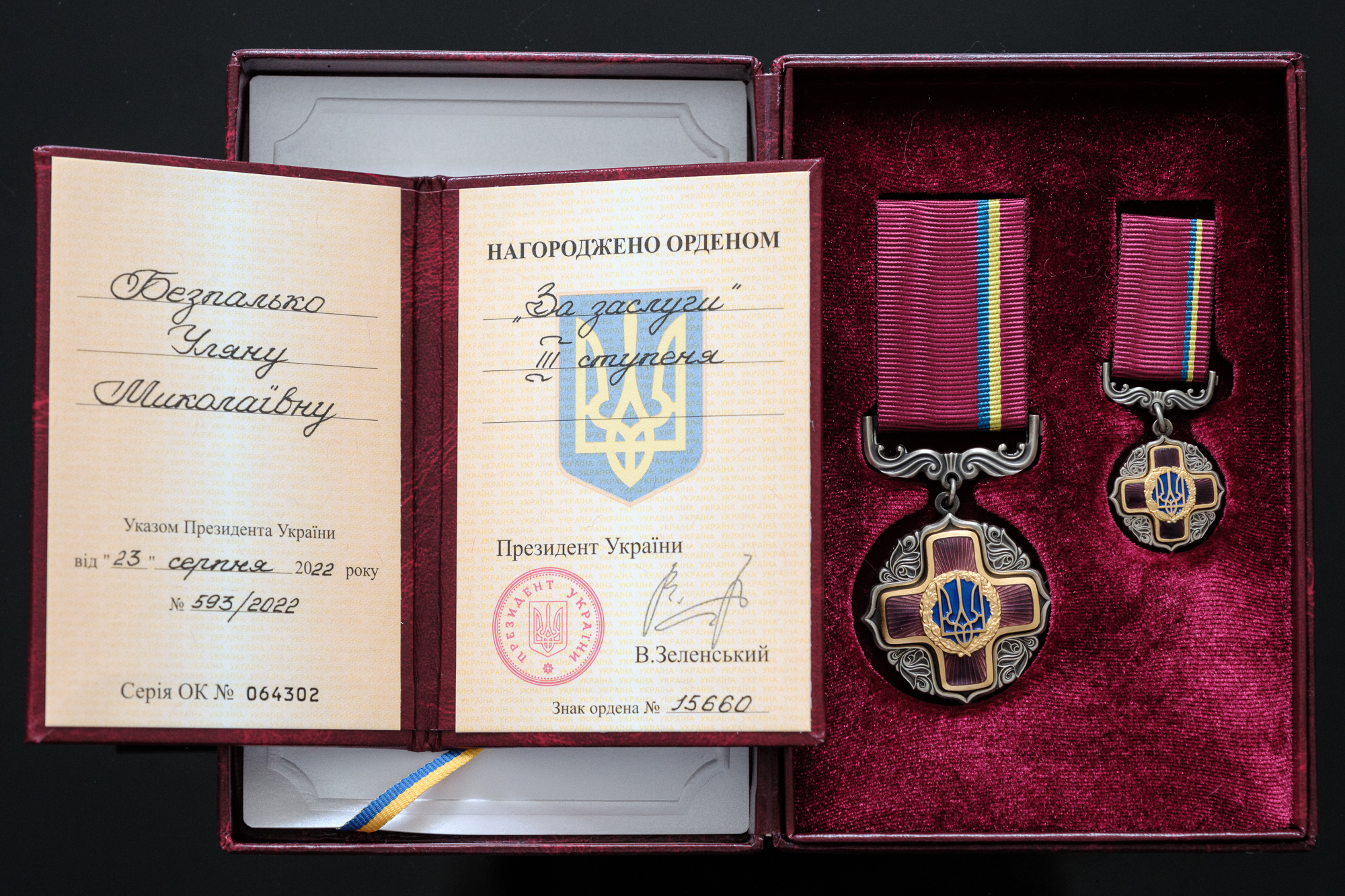 Орденом "За заслуги" ІІІ степени указом президента Украины Владимира Зеленского 23 августа 2023 года награждена Ульяна Безпалько.