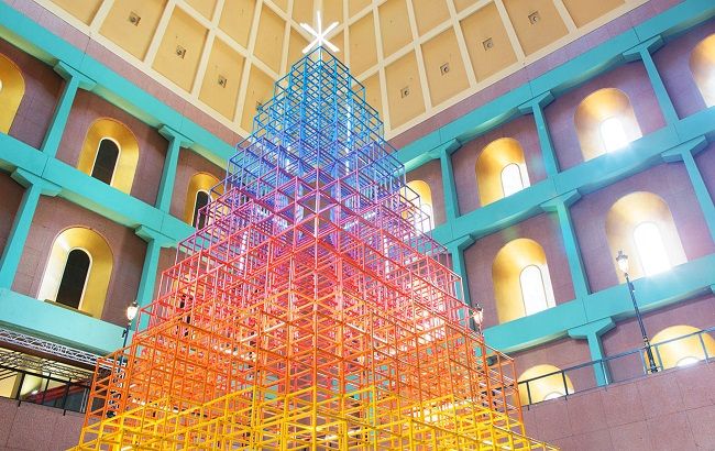 Райдужний градієнт — завжди безпрограшний варіант. Цю "візуальну фішку" використало креативне агентство OuterEdit, встановивши в одному з торгових центрів рідного Сінгапуру своє новорічне творіння. Незвичайна ялинка отримала назву "Lattice tree". Все просто, з англійської це означає "дерево-решітка". Різнокольорові металеві куби складаються в десять ярусів з LED-зіркою на верхівці, візуально утворюючи різдвяне дерево. Відвідувачі ТЦ можуть зайти всередину конструкції, розглянути перехід кольорів і, звичайно ж, зробити кілька фото.