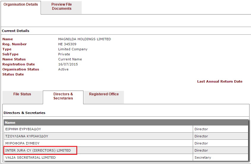 Водночас, за даними Міністерства комерції Кіпру, у Magnilda Holdings Limited є кілька директорів - найманих компаній, що виконують відповідні функції. Одна з них, Inter Jura Cy (Services) Ltd, була корпоративним директором компанії Prime Asset Partners Ltd. Останню, якщо вірити "панамським документам", було створено в інтересах президента України Петра Порошенка.
