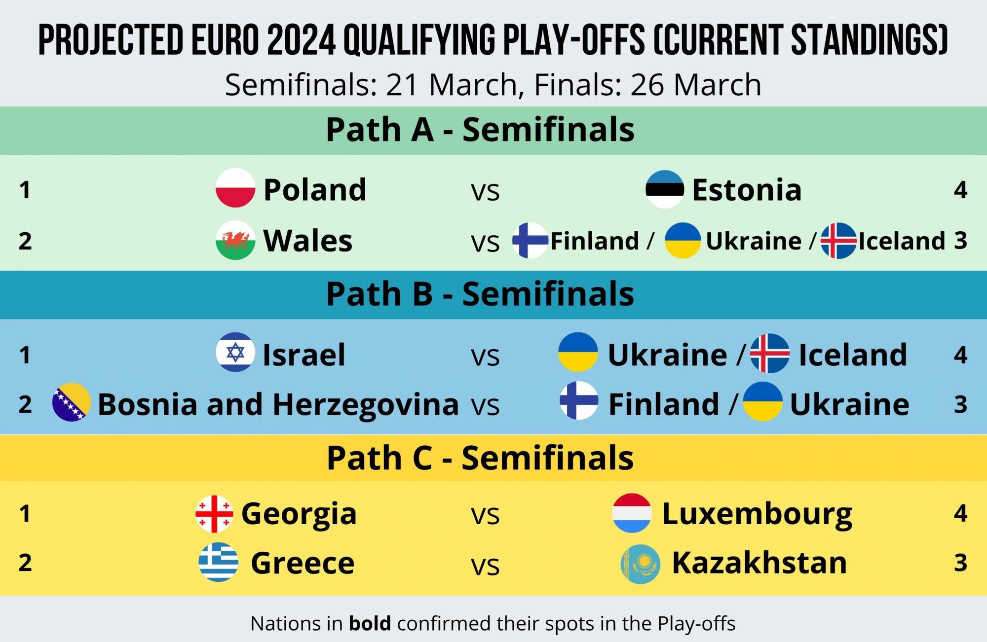 Тем временем уже сформированы полуфинальные пары пути C. Сборная Грузии примет Люксембург, а национальная команда Греции проэкзаменует Казахстан. Победители этих матчей разыграют последнюю путевку на чемпионат Европы.