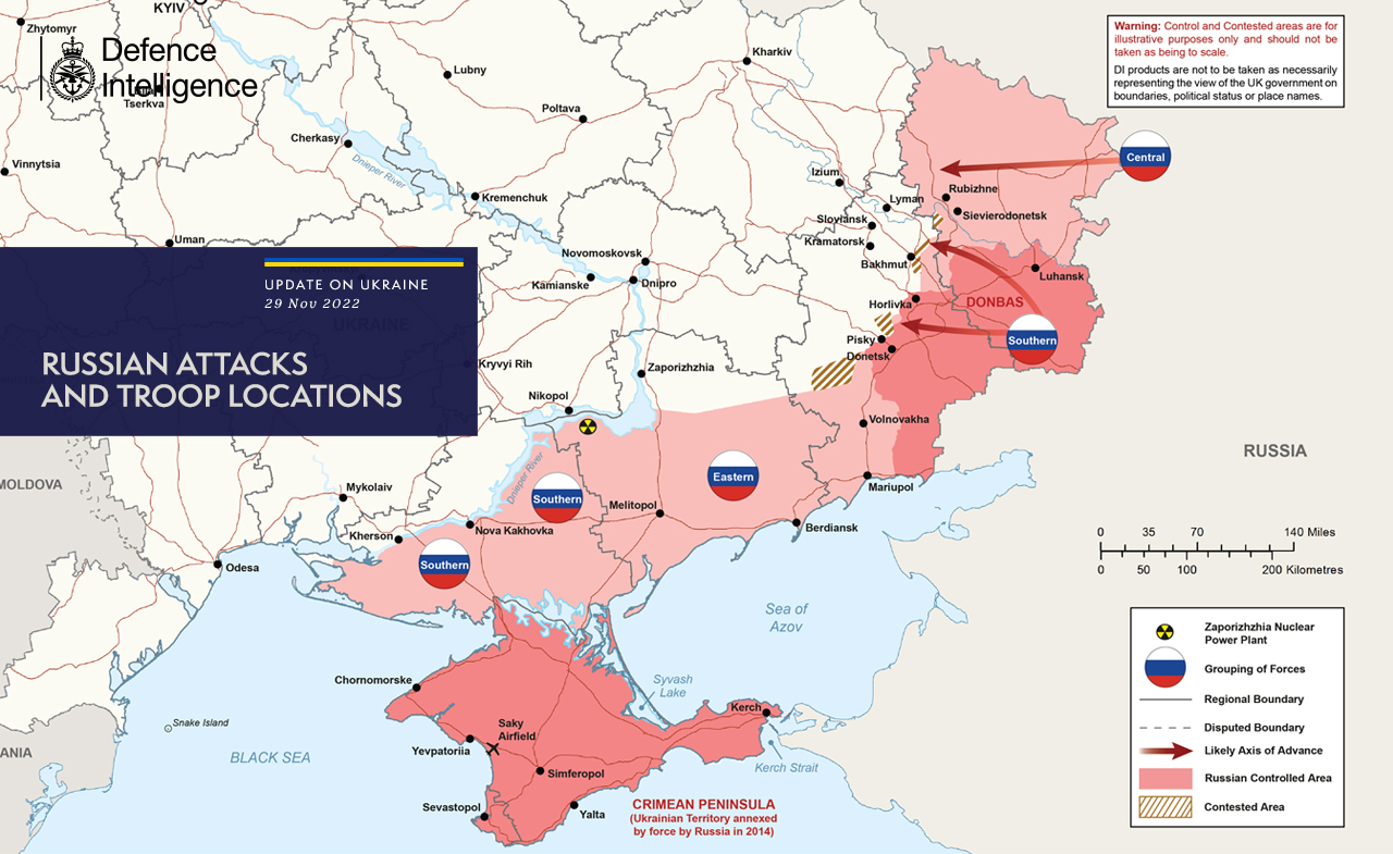 Так, согласно данным британской разведки, активные боевые действия продолжаются на Донецком и Луганском направлениях. Там оккупационные войска РФ пытаются продвинуться на трех направлениях - в районе Бахмута, Сватово и Кременной.