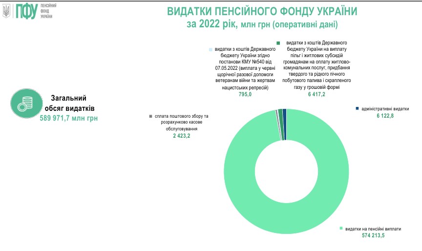 Общая сумма расходов на пенсионные и другие запланированные выплаты составила 590,0 млрд гривен, против 520,9 млрд гривен в 2021 году.