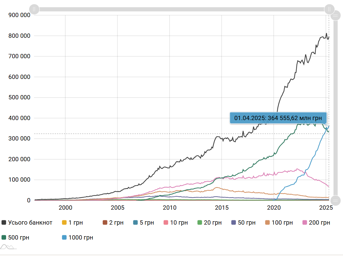 По данным НБУ, по состоянию на 1 апреля 2025 года сумма наличных, находившихся в обращении в Украине, составляла 805,1 млрд гривен.